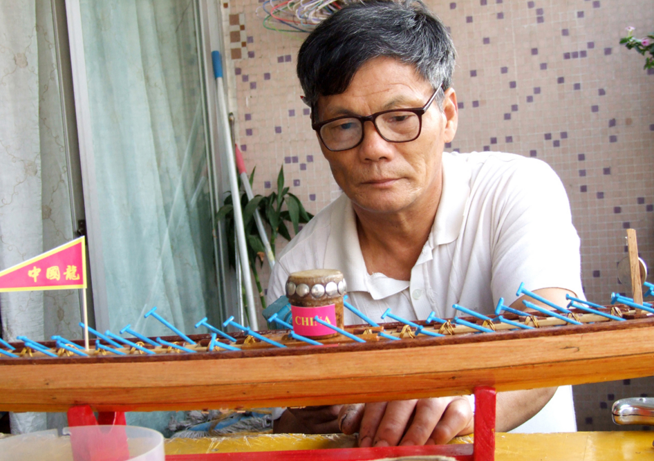 陈伟东是第十高级中学的一名心理学教师,在沙田镇土生土长的他从小对龙舟文化有一种特别的情怀,更值得一提的是,他学会了制作微型龙舟的“绝活”。