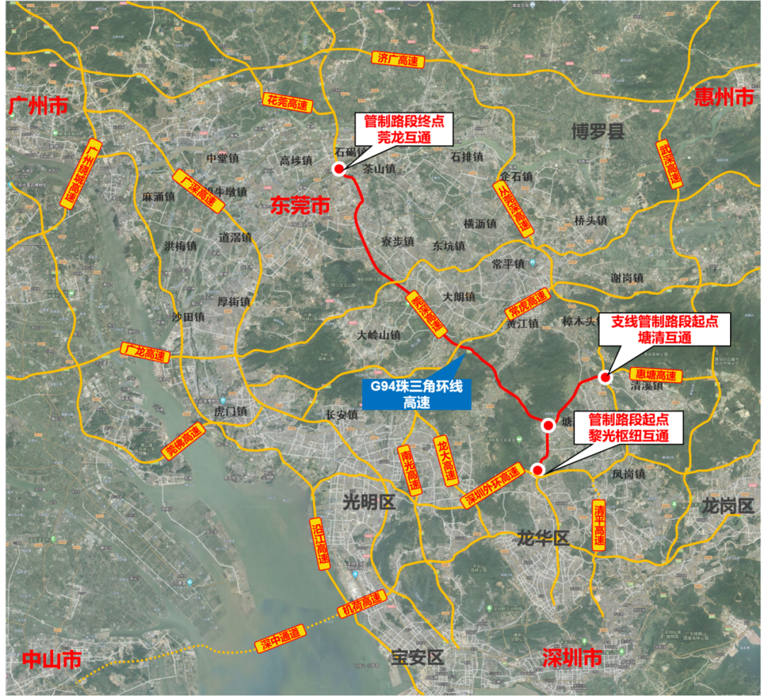 根据莞深高速改扩建工程施工计划,项目将从2025年9月30日起围蔽路肩进行施工,由于施工期间车道变窄,为保障过往车辆交通安全,决定对G94珠三角环线东莞至深圳高速公路塘厦至东城段及S22龙林支线实行降速交通管制,其中G94珠三角环线东莞至深圳高速公路塘厦至东城段车辆行驶最高时速由120公里/小时调整至100公里/小时(过渡段)和80公里/小时(改扩建路段);S22 龙林支线车辆行驶最高时速由100公里/小时调整至80公里/小时(改扩建路段)。请过往司机注意控制车速,谨慎驾驶,合理安排出行计划和选择出行路线。因施工给您带来的出行不便,敬请谅解。现就具体管制情况公告如下: 一、管制时间 2025年9月30日6时至2028年12月31日6时止,共计1188天,具体请以最新公告为准。 二、管制路段 莞深高速主线管制路段起点位于G94珠三角环线高速黎光枢纽互通北侧,终点为G94珠三角环线高速莞龙互通南侧;龙林支线管制路段起点位于G94珠三角环线高速塘厦枢纽互通,终点为S22惠塘高速塘清枢纽互通西侧。具体限速路段如下: (一)北行方向(往广州方向) 1.G94珠三角环线高速观澜主线收费站北侧至黎光枢纽互通北侧段车辆行驶最高时速为100公里/小时。 2.G94珠三角环线高速黎光枢纽互通北侧(运营桩号K19+189)至莞龙互通南侧(运营桩号K65+638)段车辆行驶最高时速为80公里/小时。 (二)南行方向(往深圳方向) 1.G94珠三角环线高速石碣互通(运营桩号K70+429)至莞龙互通南侧(运营桩号K65+638)段车辆行驶最高时速为100公里/小时。 2.G94珠三角环线高速莞龙互通南侧(运营桩号K65+638)至黎光枢纽互通北侧(运营桩号K19+189)段车辆行驶最高时速为80公里/小时。 (三)龙林支线西行方向(往莞深主线方向) 1.S22惠塘高速清溪湖互通(运营桩号K42+416)至塘清互通(运营桩号K49+679)段车辆行驶最高时速为100公里/小时。 2.S22惠塘高速塘清互通(运营桩号K49+679)至G94珠三角环线高速塘厦枢纽互通(运营桩号K60+000)段车辆行驶最高时速为80公里/小时。 (四)龙林支线东行方向(往惠州方向) 1.G94珠三角环线高速塘厦枢纽互通(运营桩号K60+000)至塘清互通(运营桩号K49+679)段车辆行驶最高时速为80公里/小时。 2.S22惠塘高速塘清互通(运营桩号K49+679)至清溪湖互通(运营桩号K42+416)段车辆行驶最高时速为100公里/小时。 管制路段示意图 三、参考绕行路线 如管制路段出现拥堵情况,司乘人员可绕行从莞深高速。 区域分流绕行路线 特此公告。