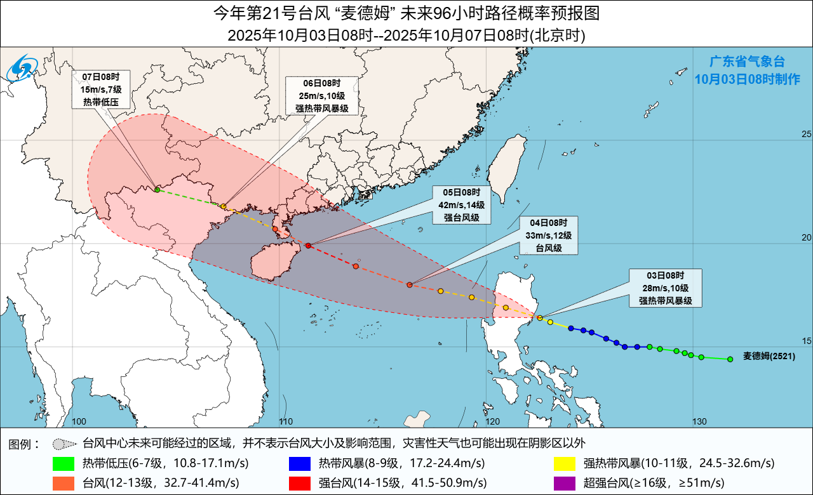 计划外出游玩的小伙伴注意!今年第21号台风“麦德姆”即将登陆,受其外围环流影响,东莞将有大雨、局部暴雨。值得关注的是,今年中秋节将迎来“超级月亮”,台风天会影响赏月吗? 今年第21号台风“麦德姆”,10月3日08时其中心位于北纬16点4度,东经122点6度,也就是距离菲律宾马尼拉偏东方向约265公里,中心最低气压982百帕,中心附近最大风力10级(28米/秒,强热带风暴级)。 预计,“麦德姆”将以25公里左右的时速向西北方向移动,强度逐渐加强,穿过菲律宾吕宋岛后于3日傍晚前后移入南海,强度逐渐加强,最强可达强台风级(14级左右),5日白天在粤西到海南岛东部之间的沿海地区登陆。 受其外围环流影响,4—5日我市雷阵雨转中到大雨、局部暴雨,并伴有6到7级、局部8级阵风;过程累计雨量30~40毫米、局部50毫米以上,最大时雨强20毫米左右,主要风雨时段在4日夜间到5日白天,较大风雨影响区域为临深片、松山湖片南部和滨海片。展望6日降雨减弱。请大家密切关注台风发展动态,注意防御强降水、雷雨大风等强对流天气及其引发的次生灾害。 中秋“超级月亮”要来了! 台风会耽误赏月吗? 10月6日就是中秋节啦,今年中秋是“十五的月亮十六圆”,最圆时刻为7日11时48分。 值得一提的是,这轮中秋满月的“个头”,在本年度所有满月中排名第三,称得上是一轮“超级月亮”。 当“超级月亮”来临时,月球位于近地点,视觉直径会增大14%,亮度则能提升30%。 天文专家提醒,由于最圆时刻发生在白天,感兴趣的公众可于6日晚或7日晚,欣赏这轮中秋圆月。 10月6日中秋当天,最佳的赏月时间是23时47分月亮升得最高,也最亮。 有不少小伙伴担心,台风天下雨会影响赏月↓ 对此,广东省气象局首席预报员表示,目前来看,台风“麦德姆”对广东陆地的影响,在6日早晨基本就趋于结束。中秋节夜间,粤西的湛江茂名云量会多一些,其余地区云量比较少,对中秋赏月影响比较小。东莞小伙伴可以准备烧烤赏月啦。