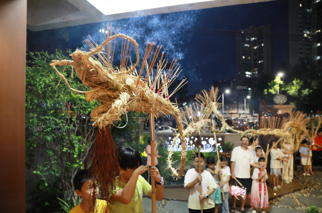 10月6日晚上,刘黄村举办了一场传统味十足的庆中秋活动,舞草龙、担灯笼,几乎整个村的孩子都来了,中秋氛围感直接拉满! 舞草龙 舞草龙在东莞已有数百年的历史,在多个镇流行。这项传统习俗象征着力量、勇气和好运,凝聚了东莞人民对美好生活的向往和祈愿。 草龙身上插满了燃烧着的香支,在黑夜中散发出点点星光,威猛又灵动。 “今年虽然只有一条龙,但是今年的草龙是最长的,在大人的指挥下,今年也舞得最快最利索。希望以后每年都可以参加,我觉得这样很有过中秋的气氛。”已经参加多年活动的小村民刘美钰说。 “一条龙来,添香大发财,恭喜你发财……”,第二年参加活动的小村民刘展衔,手持爷爷给他制作的短草龙,跟随长草龙队伍唱着歌谣到村民家祈福。他自豪地说,“这是爷爷亲手做的,我非常喜欢,也非常开心。” △小村民刘展衔(左)举着自家制作的草龙,跟着队伍一起巡游 除了小朋友,不少年纪稍长的村民都觉得很有节日气氛,其中一个村民刘先生也带了自己家的小朋友到现场参加活动,他表示:“我们小时候就有舞草龙的传统,以前是连续舞3天,从八月十三一直舞到八月十五中秋节当晚。村里恢复这个传统之后,我觉得是让小朋友了解中秋传统一个很好的途径,特别有意义。” “游鱼游耍碌,添油添蜡烛”,中秋夜,一群小朋友一边唱着茶山本地童谣,一边提着灯笼游南社古村,其乐融融、童趣满满。 游耍碌 “游耍碌”意为玩柚子灯笼,是一种古老的风俗。 相传古时因为受物质条件限制,普通百姓人家用不起纸,但本地人过中秋家家户户必有柚子,这种水果外皮圆润肉厚,适合制作灯笼;柚子又称“碌柚”“和碌”,寓意“和和睦睦”,因此柚子灯笼在东莞长盛不衰。早期儿童提的是柚子做的灯,近代才改用各种轻便灯笼。一边走一边唱着耍乐歌。 在“游耍碌”过程中,如果蜡烛烧完,向商家讨要,谓之添油。商家一般都会给予,体现了东莞人爱幼和互助的精神。“游鱼游耍碌,添油添蜡烛”成为了东莞人的独特中秋记忆。 为了传承这种本土的中秋习俗,茶山的宝爸宝妈们特地为小朋友换上传统服饰,带着他们到南社古村一起体验“游耍碌”。 小朋友有的提着传统手工灯笼,有的提着可爱的“月兔”灯笼走街串巷,传统样式的纸灯笼晃着暖光,电子灯笼里循环着儿时的旋律,跑过时洒下一路童趣。