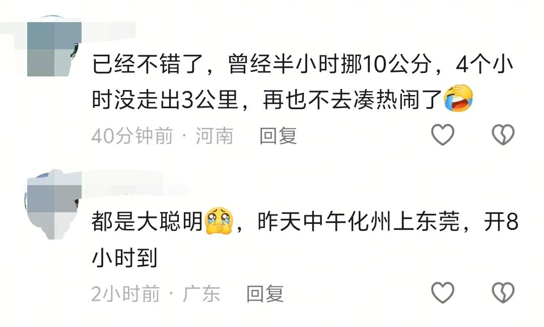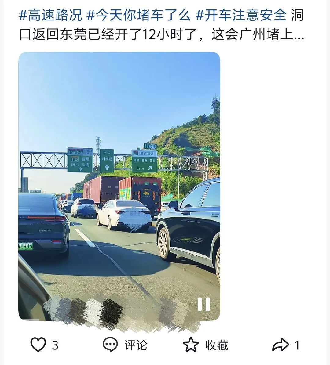 堵堵堵! 车车车车车车车你车车车车车车车车车车车车车我车车车车车车 10月7日、8日,广东将迎来双节返程小高峰,高速公路车流量预计达到951万车次,但不少小伙伴表示:昨天就堵在路上了! ▲网友视频截图 10月6日,国庆第一波回程“大聪明”已连夜出发,高速堵了走国道,3.6公里走30分钟,还有人4小时走了不到3公里,从化州回东莞,开了8小时。 6号早上8点出发 7号早上6点到 从湖南洞口回东莞开了12小时 还在广州…… 堵堵堵~ 屁股都坐疼了 返程高峰已杀到!建议广大市民提前规划路线,通过地图导航软件查看最优路线,并实时关注路况信息,尽量避开拥堵。 易拥堵路段及节点 根据交警部门节前发布的“两公布一提示”,今年我省中秋国庆假期期间较为拥堵的路段、收费站、车流较饱和服务区以及充电设施利用率高的服务区有以下这些: 繁忙高速公路路段(含收费站、高接高枢纽互通)共10处 车流繁忙服务区共5处 充电繁忙服务区共3处 此外,乘坐东莞地铁的小伙伴注意了! 目前虎门火车站的末班车时间,从原本的23:05延长至23:35,东莞火车站末班车时间保持不变。 东莞地铁有调整 10月6日至8日,虎门火车站的末班车时间从原本的23:05延长至23:35,延长时段内行车间隔约为10分钟,以更好地衔接返程旅客的出行需求;东莞火车站末班车时间则保持23:00不变,市民可根据自身行程合理选择乘车时间。 温馨提醒 控速不松懈,“慢一点”才是真安全; 防疲劳驾驶,“歇一歇”才能走更远; 无论是返程还是仍在旅途,都希望大家能把安全放在首位。▲资料图
