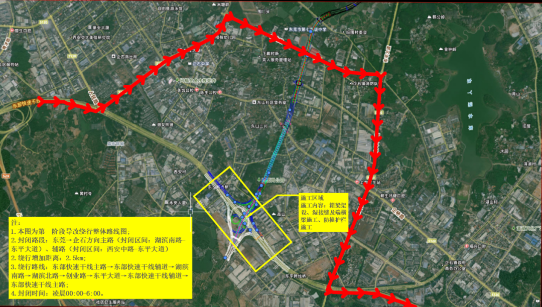 关于东部快速路企石段临时交通管制的通告 因环莞路北延线工程建设需要,东部快速路企石段(企石跨线桥--东平跨线桥)将于2025年10月9日至10月31日(23:30-次日06:30)进行道路封闭施工,届时将对上述路段进行临时交通管制,现公告如下: 一、第一阶段: 1、施工时间:2025年10月9日至10月12日(23:30-次日06:30)。 2、施工路段:东部快速路企石段(企石跨线桥--东平跨线桥)东莞市区→桥头镇方向。 3、封闭施工方式及行车方向: 2025年10月9日至10月12日(23:30-次日06:30),封闭既有东部快速路企石段东莞市区→桥头镇方向主路和辅路,车辆可沿东部快速路→湖滨南路→湖滨北路→创业路→东平大道→东部快速路绕行。 二、第二阶段: 1、施工时间:2025年10月13日至10月26日(23:30-次日06:30)。 2、施工路段:东部快速路企石段(企石跨线桥--东平跨线桥)桥头镇→东莞市区方向。 3、封闭施工方式及行车方向通知: 2025年10月13日至10月26日(23:30-次日06:30),封闭既有东部快速路桥头镇→东莞市区方向主路和辅路,车辆可沿东部快速路→东平大道→创业路→湖滨北路→湖滨南路→东部快速路绕行。 三、第三阶段: 1、施工时间:2025年10月27日至10月31日(23:30-次日06:30)。 2、施工路段:东部快速路企石段(企石跨线桥--东平跨线桥)东莞市区→桥头镇方向。 3、封闭施工方式及行车方向:2025年10月27日至10月31日(23:30-次日06:30),封闭既有东部快速路企石段东莞市区→桥头镇方向主路和辅路,车辆可沿东部快速路→湖滨南路→湖滨北路→创业路→东平大道→东部快速路绕行。 四、温馨提示 请广大市民在出行前掌握交通动态,提前规划选择合适的路线出行。 东莞市公安局交通管理支队企石大队 2025年10月7日