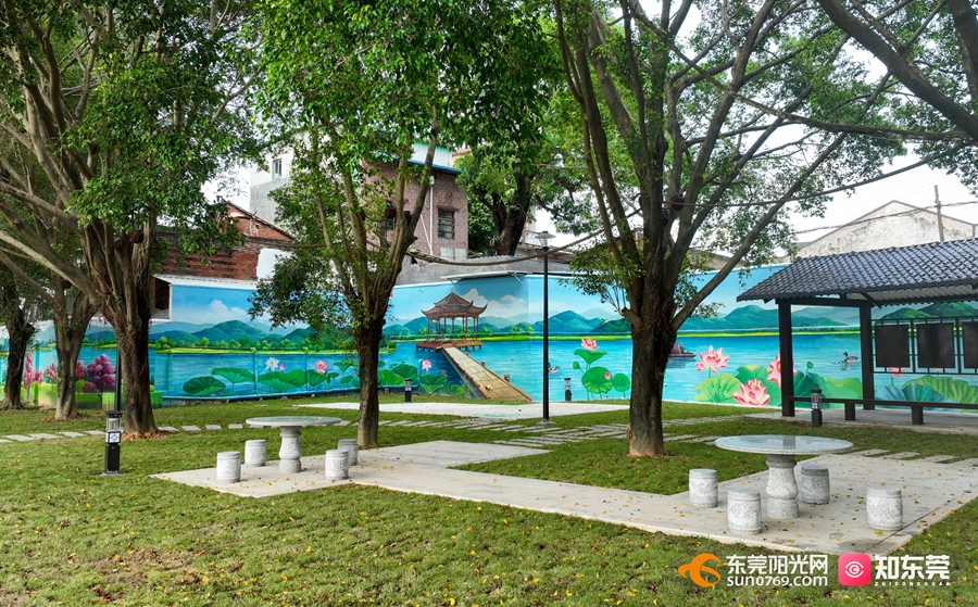 位于李屋村文化广场旁的公共休闲绿地,占地面积约2160平方米。此次升级改造工程综合了园建、绿化、给排水、电气及结构等多专业设计,对场地进行了彻底焕新。项目不仅保留了原有的榕树遮荫优势,更增设了展现桥头荷花名镇特色的荷花主题墙绘、可供村民遮风避雨休憩的风雨连廊、实用的座椅石凳、多样的健身器材以及蜿蜒的石砖步道。如今,这片“榕荫荷韵”绿地,既完善了休闲功能,也提升了景观品质,成为村民享受自然、交流互动的重要场所。