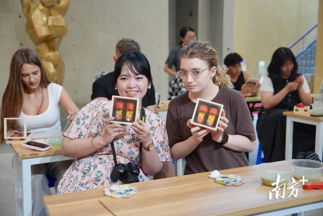当天,梁锦泉和儿子梁家聪指导十余名留学生和网红博主现场绘制迷你木屐。采风团认真了解木屐历史,亲手绘下喜欢的图案,并做成木屐冰箱贴,收获一件时尚单品。在留学生和网红博主笔下,中国龙、花卉甚至labubu都成为木屐的装饰,碰撞出新的文化火花。