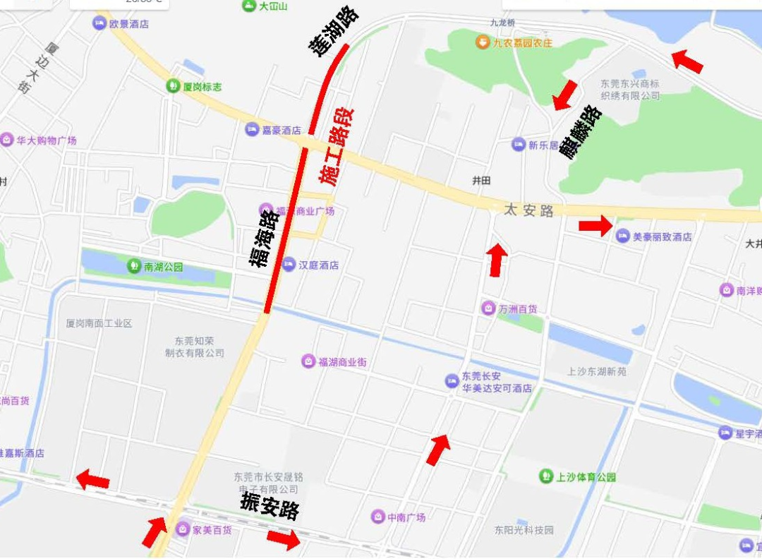 因甬莞-莞佛高速公路常平至虎门段延长线工程第一合同段施工需要,2025年10月-2026年9月占用福海路—莲湖路(福湖酒店向北至明发化工全长约1300米范围)中央分隔带以及临中央分隔带两侧各1-2道机动车道。施工期间交通管制有关事项如下:
