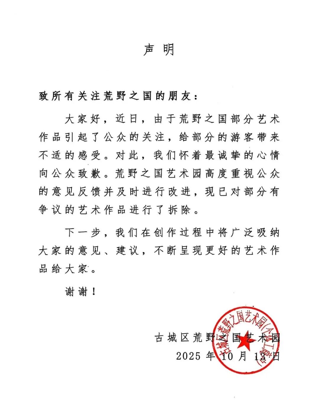 “荒野之国”艺术园发布声明致歉称,“部分艺术作品引起关注,给游客带来不适感受。艺术园高度重视意见反馈,已对部分有争议作品进行拆除。”