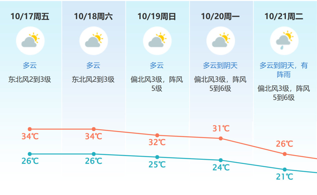 预计我市17—18日多云,天气炎热;19—20日受冷空气影响,多云到阴天,气温小幅下降;21—23日有阵雨,气温继续下降,日温差减小。