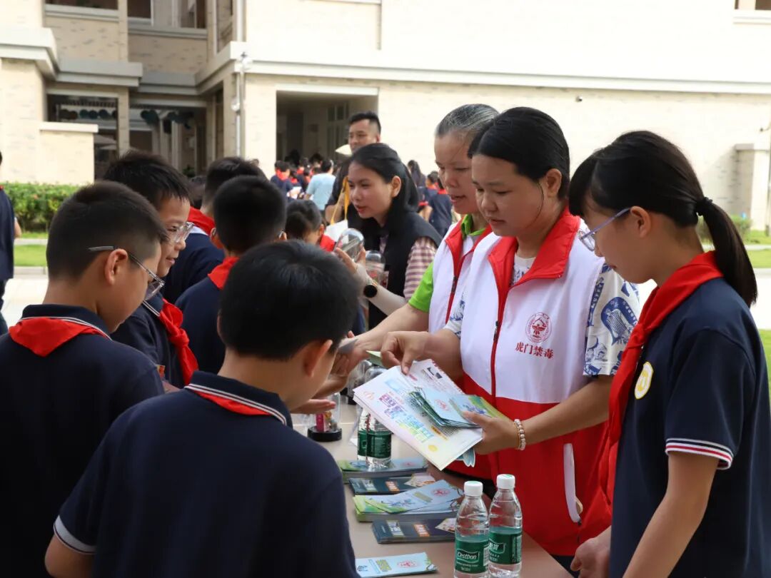 宣讲课结束后,活动进入第二部分课后摊位宣传。禁毒社工与志愿者们搭建好宣传摊位,现场摆放了仿真毒品模型,并准备了禁毒宣传单。摊位前,禁毒社工热情接待每一位前来咨询的学生,拿起仿真毒品模型,逐一讲解其与普通物品的区别。此外,志愿者们还向学生们派发禁毒宣传单页,鼓励大家将学到的禁毒知识分享给家人朋友,让禁毒宣传从校园延伸到家庭,形成 “教育一个学生,影响一个家庭” 的良好效果。