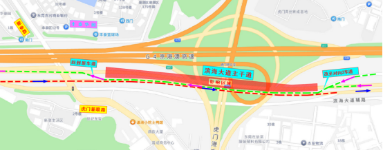 2.外部绕行路线(虎门高铁站→虎门东站方向):滨海大道→站北路→莞太路→滨海大道辅道→滨海大道,或滨海大道→新联路→莞太路→滨海大道辅道→滨海大道。