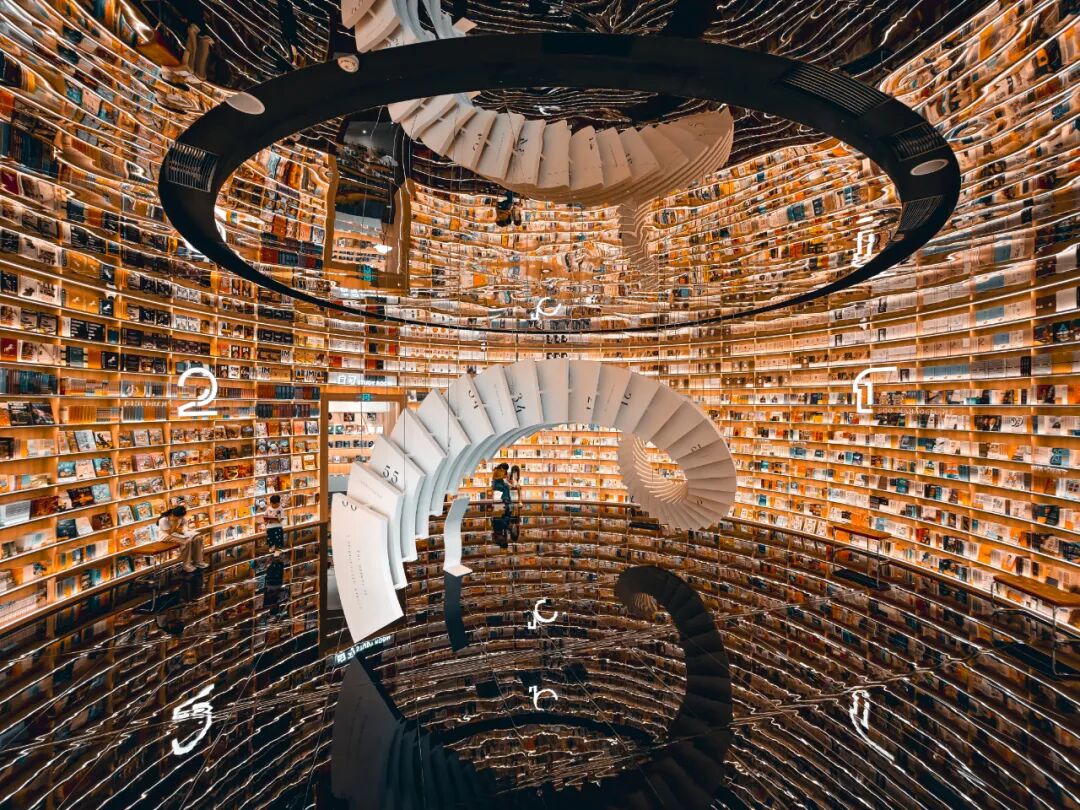 拱形镜面构筑的环形通道“魔幻”风十足,木质书架与暖色调灯光交织,光影交错间,宛如穿梭知识年轮。