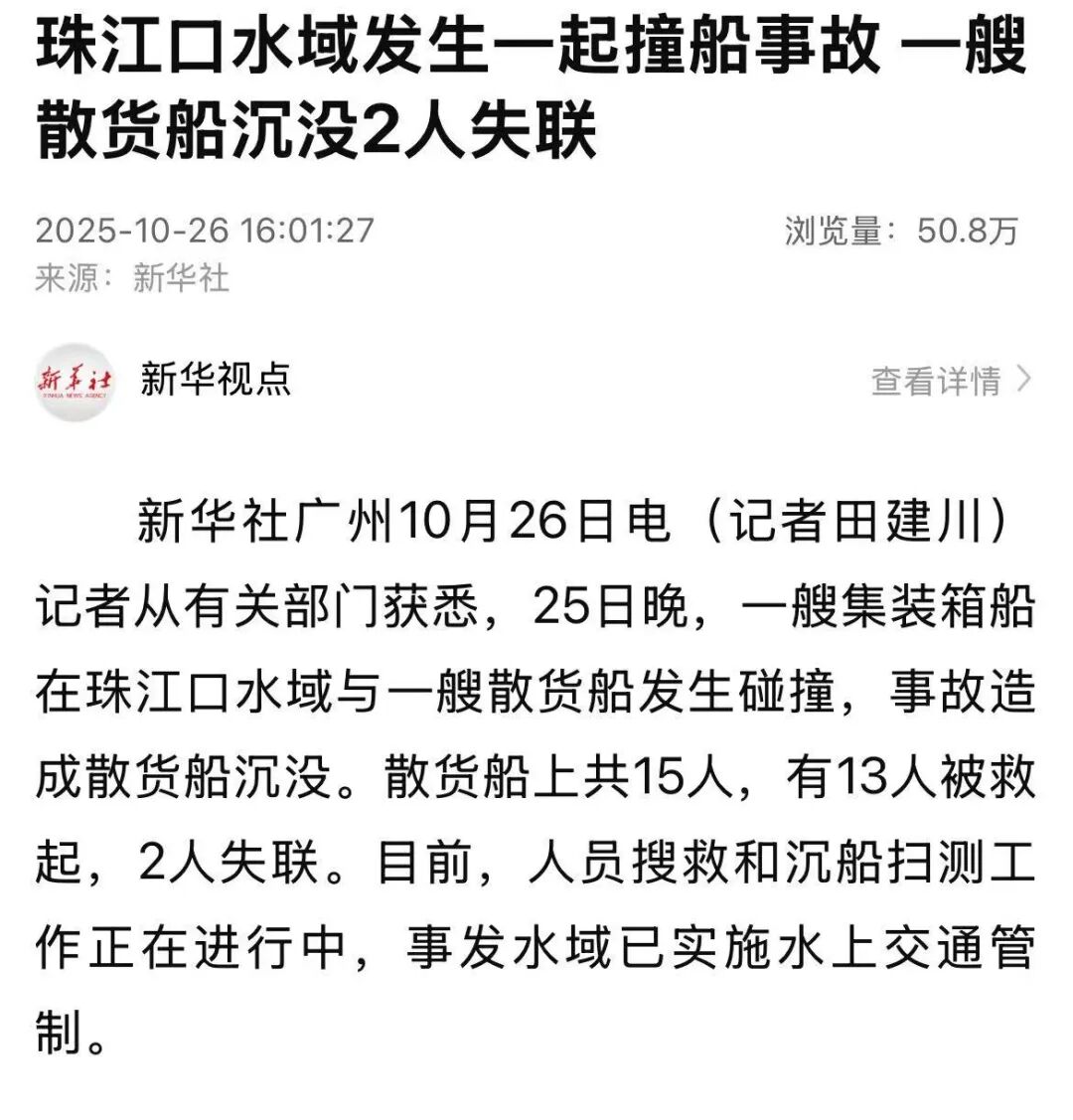 珠江口水域发生一起撞船事故,一艘散货船沉没2人失联