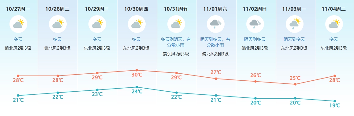 10月27日—30日,多云为主,早晚清凉,午间较热。