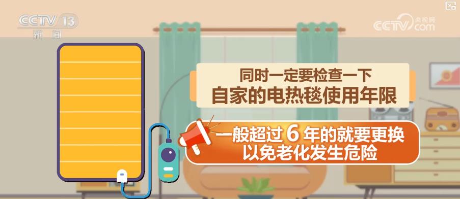 需要留意的是,不要把电热毯放在金属物或尖、硬物上使用,以免造成破损,导致线路短路。同时一定要检查一下自家的电热毯使用年限,一般超过6年的就要更换,以免老化发生危险。