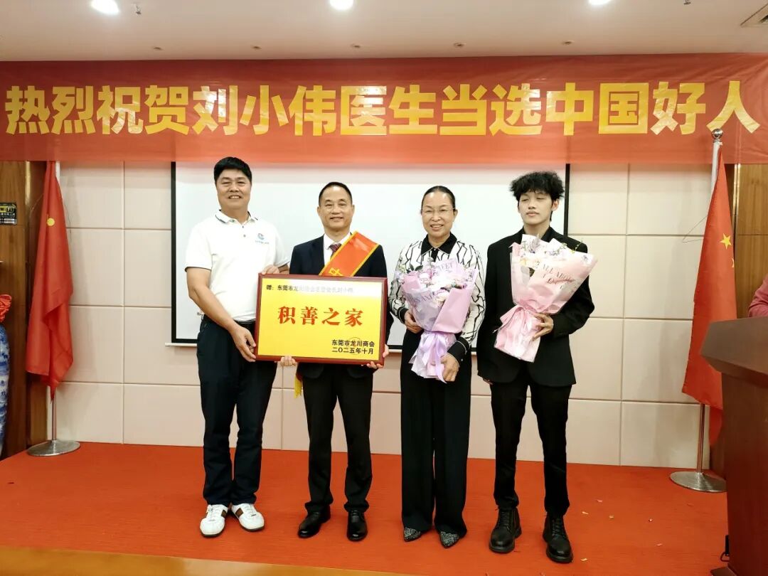 在授牌环节,东莞市龙川商会为“中国好人”刘小伟医生一家授予了“积善之家”的牌匾。这一荣誉不仅是对刘医生个人的认可,更是对其家庭一直以来默默支持和共同参与公益事业的肯定。