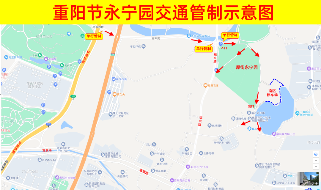 交通管制通告 为确保重阳节扫墓活动交通安全、畅通,10月29日重阳节当天,厚街交管部门将对永宁园、河田公墓园、龙溪公墓园及周边道路进行交通管制,具体措施如下: 管制时间:2025年10月29日9时—17时。 管制措施: 一、将军路(环莞快速至福东路路口)实施自西向东单向行驶,即由环莞快速往福东路方向单向行驶,福东路双方向车辆不得转入将军路。 二、厚街镇永宁园在管制时间实行单向行驶措施,福东路为入口,汀山社区东埔路口为出口,请广大司机按照有关指示牌行驶,永宁园内停车位充足,请勿乱停乱放。 三、河田公墓园、龙溪公墓园由于车位有限,当停车达到饱和后将禁止车辆进入,请广大司机按照现场交警指挥或现场指示标识安全行驶。 东莞市公安局交通管理支队厚街大队 2025年10月28日