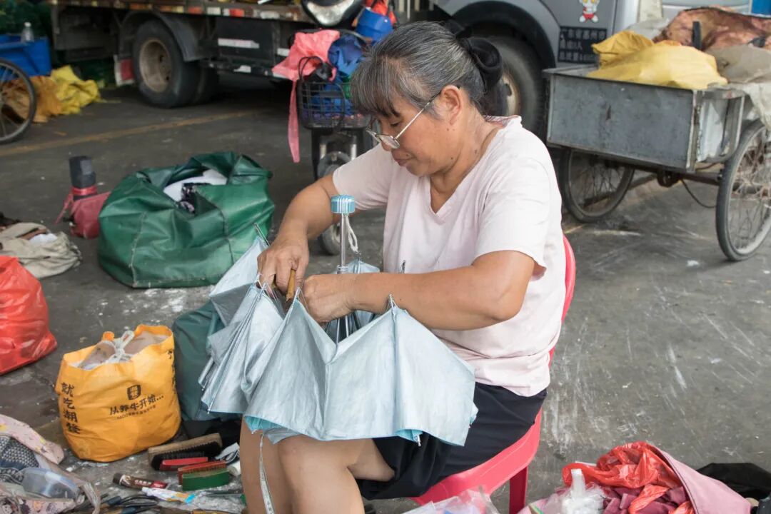 祖姨的摊位守在细村市场的一角,这里没有华丽的店铺,也没有响亮的招牌,只有一辆破旧的三轮车,地上摆着几样修伞修鞋的工具。