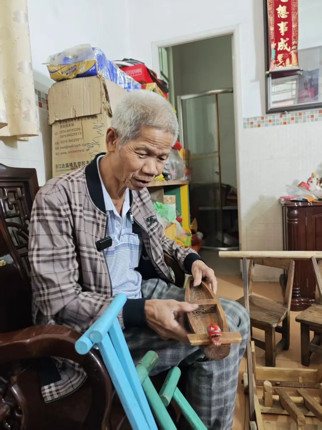 于是,道滘水乡的“特产”——龙舟,在他的手中化作了孙儿们可以手持挥舞的船桨和精致的小龙舟;于是,承载着无数人童年记忆的古早学步车,被他用木材、钉子和铁锤重新诠释。
