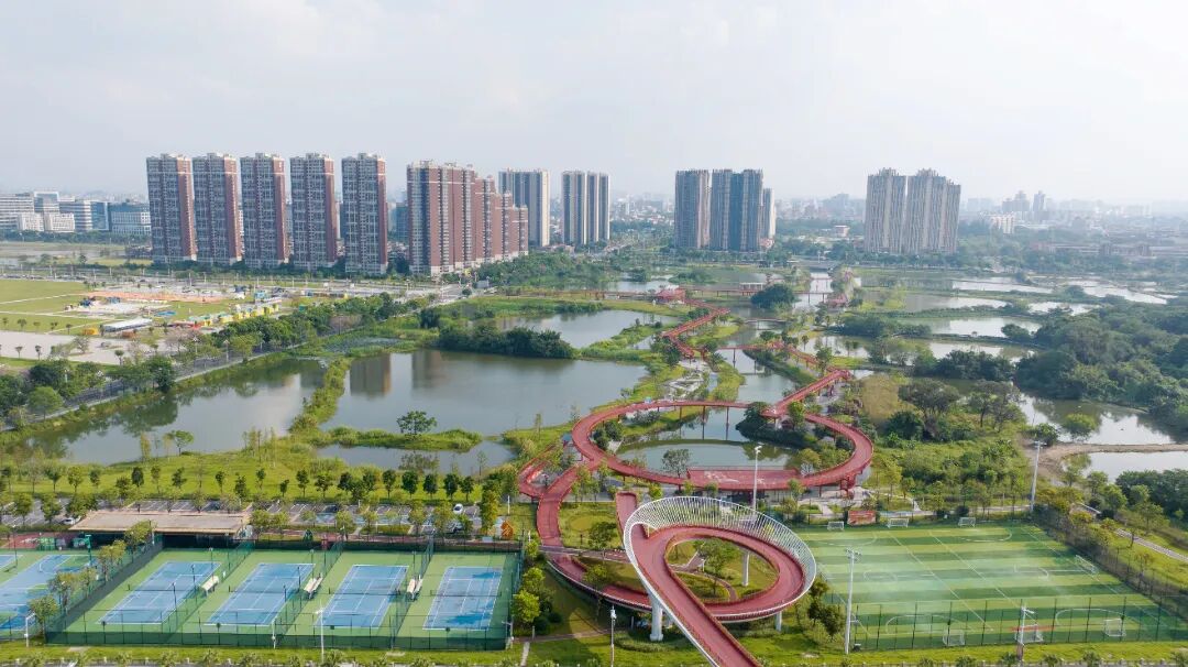 漫步石排,红石元素已深深融入城市肌理——科创公园的红石长廊,把文化装进绿意里;湿地公园的红石假山,成了市民打卡的小景致;横山循环岛的红石转盘、潮玩公园劳拉的红石底座,让红石与潮流撞个满怀。而备受青睐的网红桥,以其独特的"石排红"主色调,宛如一条红色丝带飘扬在东江之畔,成为红石文化的现代表达。