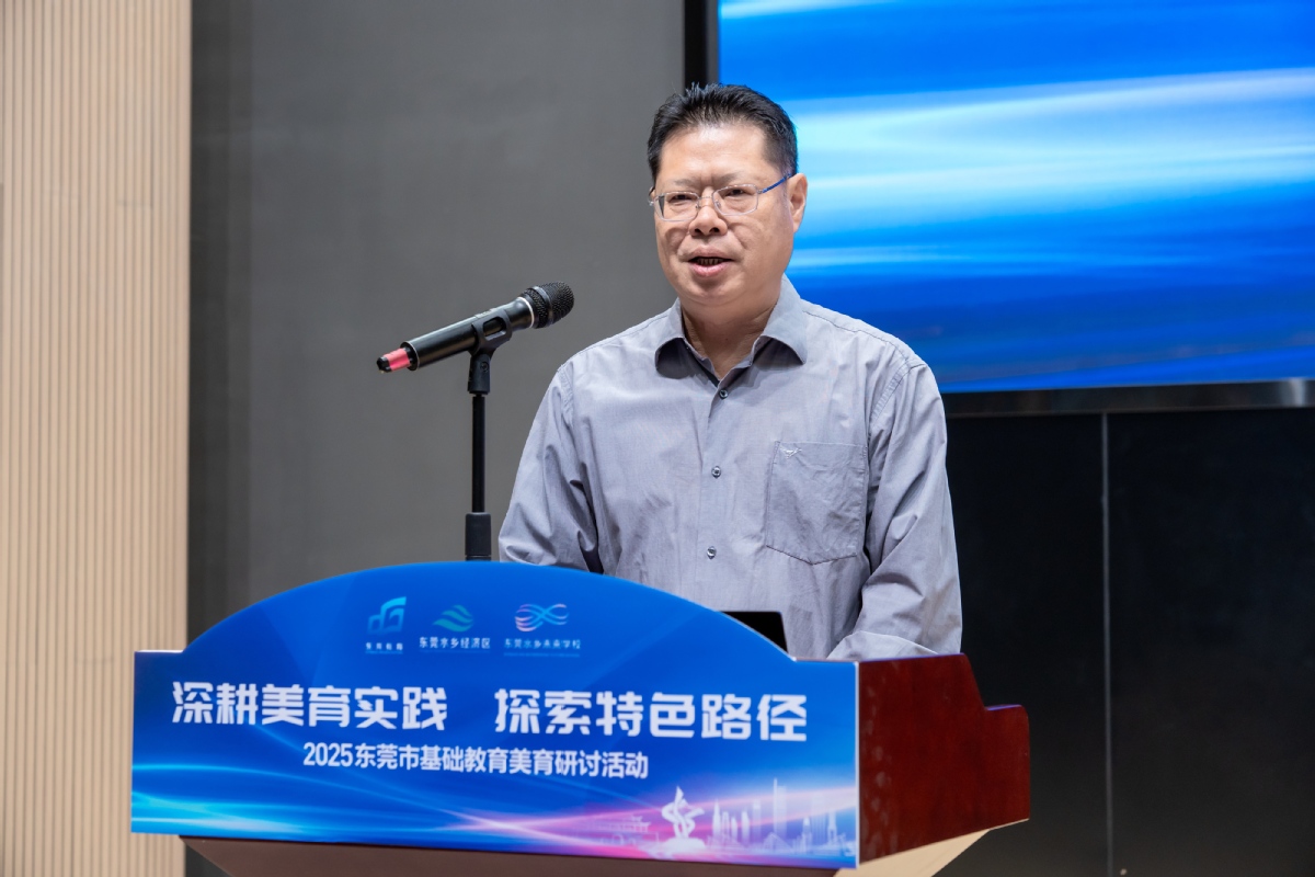 东莞市教育局四级调研员林勤在致辞中强调,美育是“五育”中最注重个性培育的一环,重在激发学生的感性思维、想象力与创造力。他指出,美育已从教育边缘跃升为核心环节,成为学生综合素养与健全人格培养的关键路径,并期待东莞水乡未来学校成为全市美育发展的重要平台。