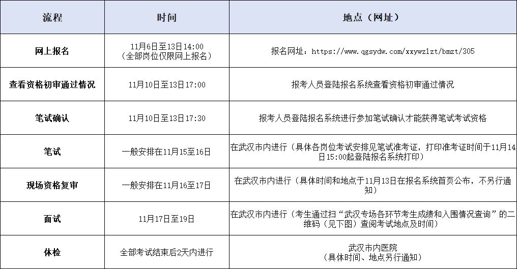 考生于11月10日至13日17:00登陆报名系统查看资格初审通过情况;全部考生须于11月10日至13日17:30登陆报名系统进行参加笔试确认才能获得笔试考试资格,已确认参加考试的考生应诚信按时参加考试,不得无故缺考。