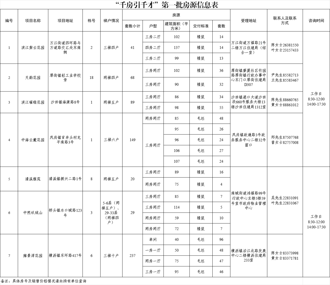 根据公告,本次“千房引千才”专项活动第一批配售房源共涉及7个住宅项目——万江滨江紫云花园2号楼,厚街天韵花园18号楼,沙田滨江璀璨花园1号楼,凤岗中海云麓花园1号楼,清溪雅苑8号楼,桥头中熙玖珑山3号楼,以及横沥雍景湾花园6号楼。