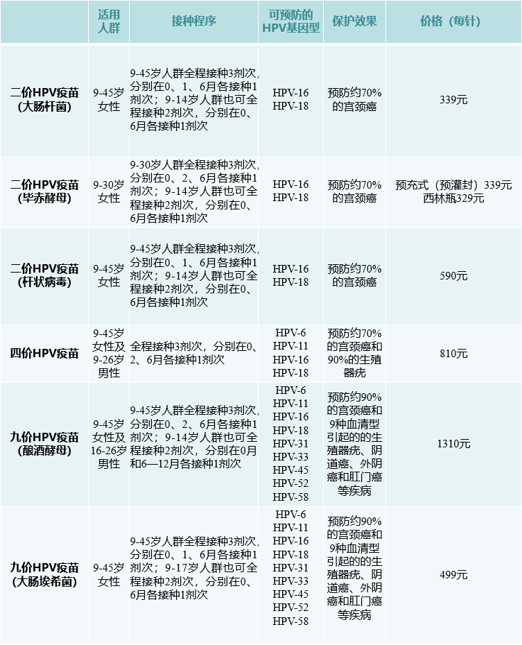 目前国内获批上市的HPV疫苗共有6种。不同的疫苗,适用人群和接种程序略有不同: