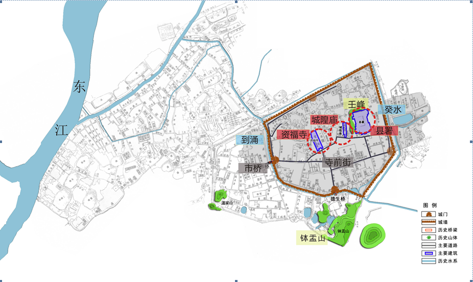 推测当时城东门在今东门路、东正路路口,西门在今市桥,南门在今人民公园德生桥位置,北门位置不详,总面积约0.45平方公里。