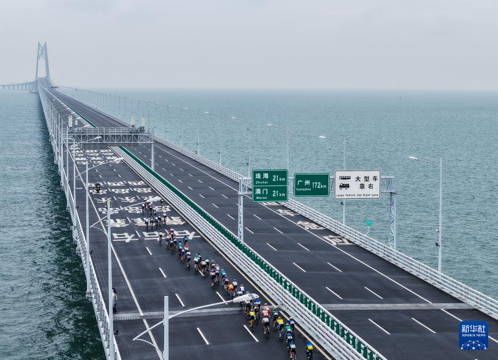 2024粤港澳公路自行车赛暨第十五届全国运动会公路自行车测试赛,选手们骑行在港珠澳大桥上。