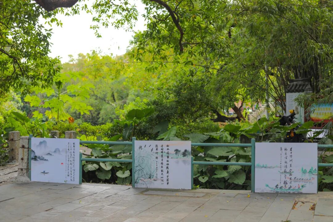 漫步公园内,数十棵古榕树交织成天然绿穹,气生根垂落形成梦幻“树帘”,而错落有致的展示架与自然景致相映成趣,展陈作品或咏叹水乡灵秀风光,或赞颂淳朴乡风民情,或抒发赤诚家国情怀,字字句句彰显出本土文化底蕴与创作才情。