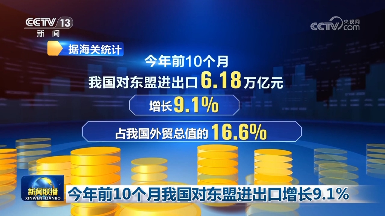 据海关统计,今年前10个月,我国对东盟进出口6.18万亿元,增长9.1%,占我国外贸总值的16.6%。