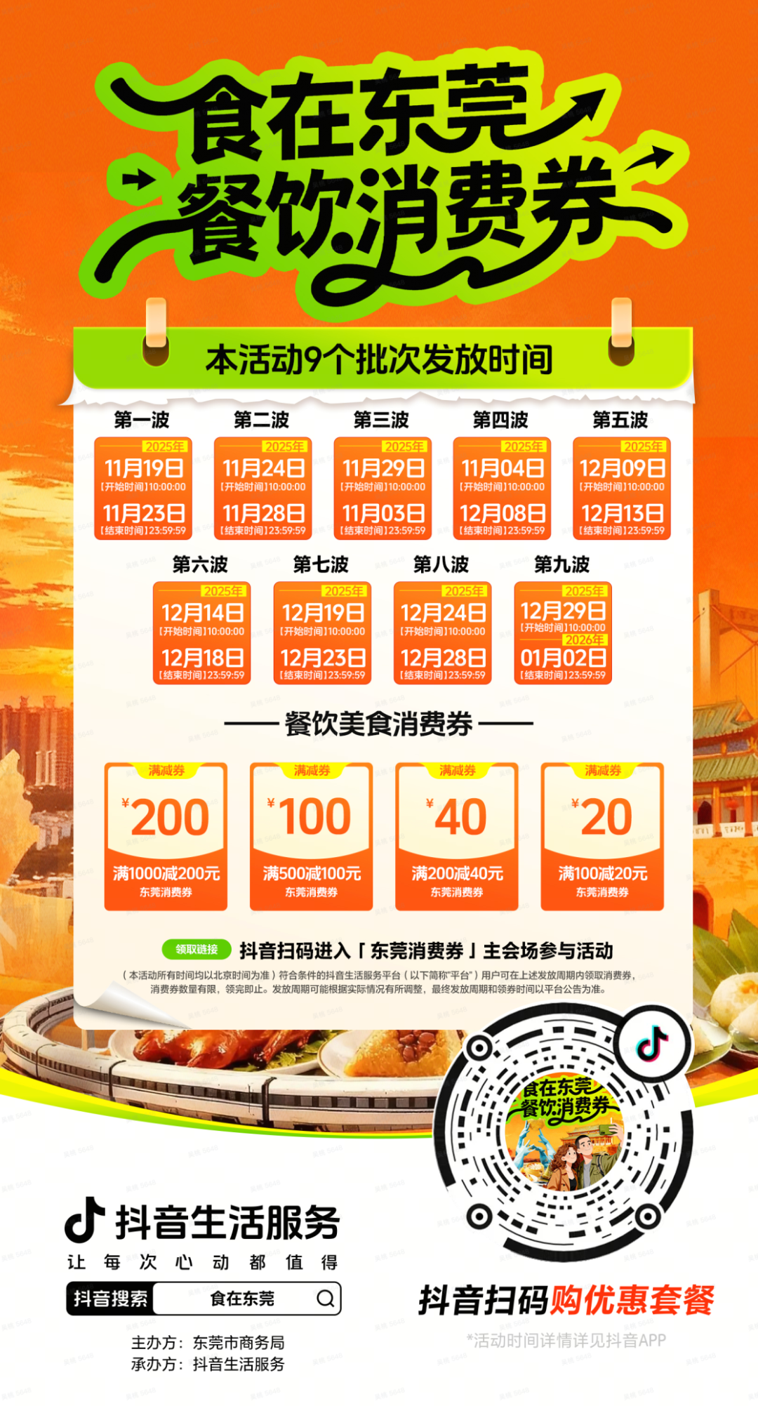 东莞1000万元餐饮补贴消费券全城火热派送中,市民可到抖音、云闪付两大线上平台领券,用券最高立减200元,干饭人千万别错过~