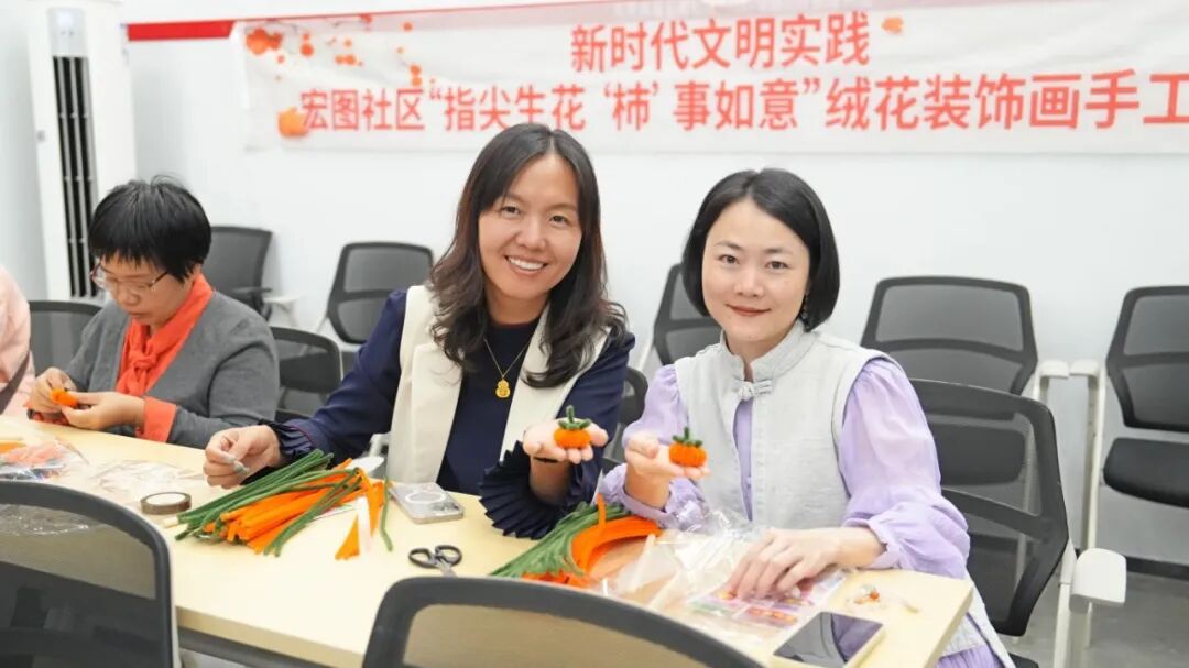 手作时光,指尖上的祝福:居民们巧手制作“柿”事如意绒花装饰画,在欢声笑语中将美好寓意与原创作品带回家。