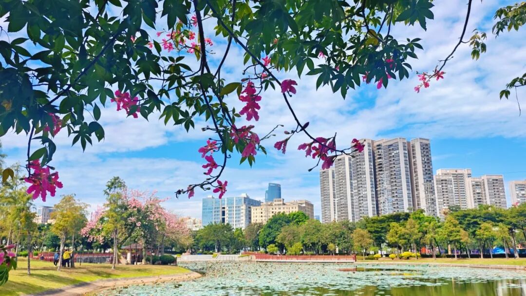 厚街的秋,藏不住满城花香。三角梅花期长,可从春天一直绽放至深秋,异木棉则每年只在11至12月,捧出限量版的粉晕,点缀厚街的街巷与公园。它们不与四季争艳,只静守厚街的晨昏。用蓬勃的生命力,诉说南国秋日的独特语法。更用绝美的秋日画卷告诉大家:“不必远行,诗意就在转角花丛中。”