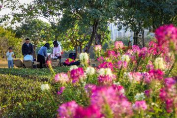 在谢岗铁路公园内,一片开阔草坪正对交错并行的莞惠城轨与广梅汕铁路,和许多靠运气的打卡点不同,这里贴心地设置了列车经过时间表。