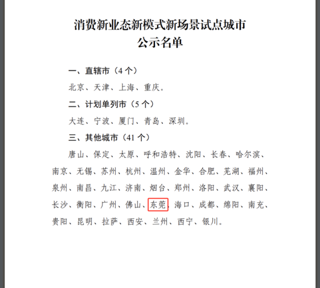 近日,商务部网站公示了消费新业态新模式新场景试点城市竞争性评审结果。东莞上榜公示名单。