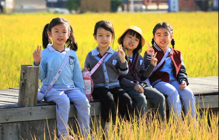 最热闹的当属茶山艺锦幼儿园的40多位小朋友,他们在老师带领下观光学习,近距离了解水稻生长与收割过程,在田间上了一堂生动的自然课。小朋友们纷纷表示,“稻谷金灿灿的,在太阳底下收稻谷又累又热,粮食来之不易,以后我会好好吃饭的。”
