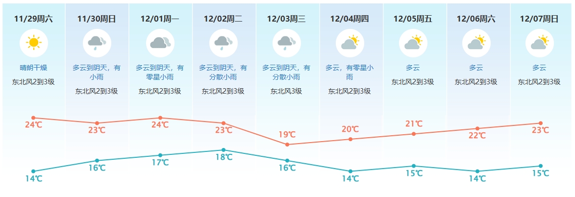 11月29日,粤西到珠江口西侧市县晴转多云,其余市县晴天为主。最低气温:粤北和珠江三角洲北部市县3~9℃,局部有霜冻,南部沿海市县11~14℃,其余市县9~11℃。