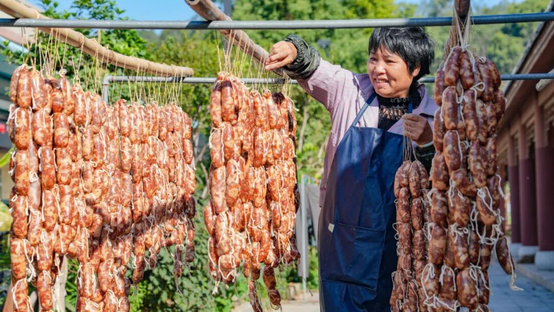 遵循“冬至前后北风起,晒腊味”的制作工艺,邓阿姨将腊肠悬挂在客家文化长廊的阴凉处,让长达15天的阳光与北风交替雕琢她的得意作品。
