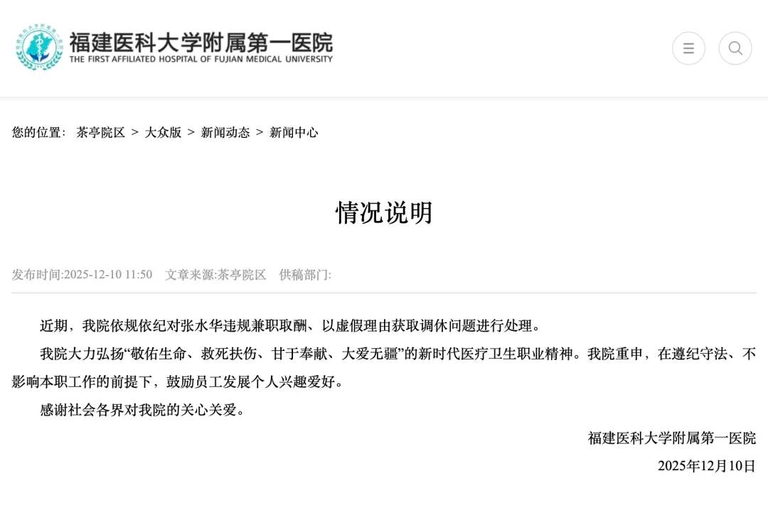 12月10日中午,福建医科大学附属第一医院发布情况说明:近期,该院依规依纪对张水华违规兼职取酬、以虚假理由获取调休问题进行处理。