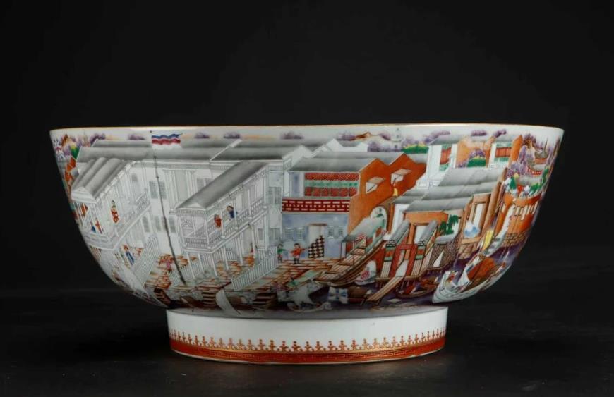 该大碗圈足外壁一圈矛头状边饰装饰,碗内部中央绘有一个花篮。这种大碗是欧洲人在宴会上调盛果酒之用,也称潘趣碗。外壁以通景彩绘方式描绘了广州十三行商馆的面貌。十三行对于广州乃至整个中国的对外贸易史都有着重要的历史意义,描绘清代十三行风景题材的艺术品以外销画为多,广彩瓷传世甚少,极为珍贵。