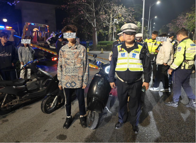 其中,12月10日1时24分许,廖某驾驶一无号牌两轮电动车在东莞市松山湖环湖路与多名驾驶两轮电动车的人员聚众,影响车辆正常通行,聚众扰乱公共场所秩序。现场,交警人员依法对廖某处以行政拘留五日的处罚。
