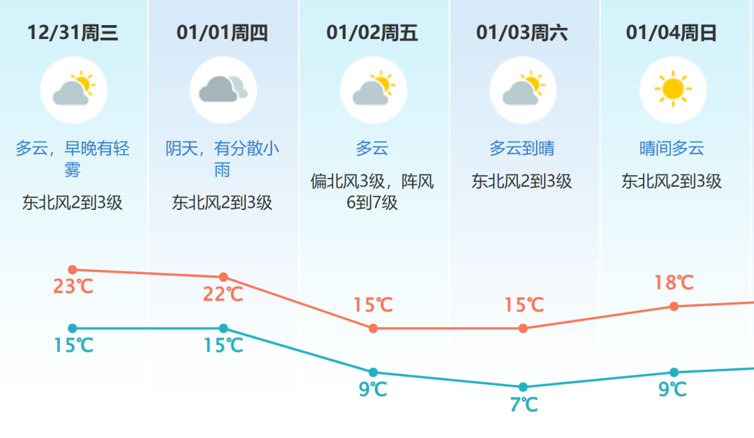 预计我市31日多云到晴,早晚有轻雾;元旦假期前期(1月1日)受高空槽影响,阴天有分散小雨;元旦假期中后期(2—3日)受冷空气影响,以多云到晴,气温明显下降。