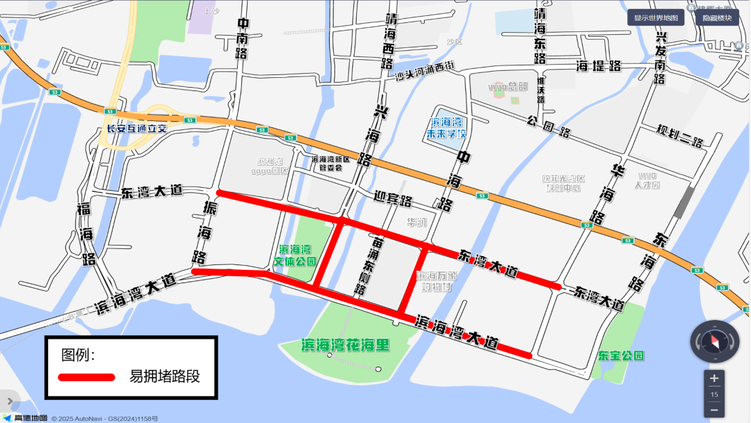 为做好元旦节假日的道路交通安全管理工作,有效缓解辖区道路交通压力,东莞市公安局交通管理支队虎门大队结合滨海湾新区实际情况,对辖区道路交通状况进行研判预测,并对部分路段实施临时交通管制措施,具体如下: 一、可能出现拥堵的路段 滨海湾大道(福海路-华海路段)、东湾大道(振海路-华海路段)、兴海路(滨海湾大道-东湾大道段)、中海路(滨海湾大道-东湾大道段),高峰期预计在12月31日18时至1月3日18时。 二、实施货车限行管理 节假日7:00-23:00,滨海湾大道(振海路-东海路段)、东湾大道、振海路、兴海路、中海路、华海路、东海路全段禁止中型、重型货车通行;滨海湾大桥全天禁止危化品运输车通行。 特别提醒,商圈、公园的停车位有限,周边车流量增加易发生拥堵,需要前往滨海万象购物村、花海里的市民朋友,请尽量错峰出行并选择乘坐公共交通工具前往。届时,交管部门将结合实际情况,安排警力对部分路段进行疏导或采取必要的交通管制措施,请大家给予支持配合,注意绕行或避开高峰。 东莞市公安局交通管理支队虎门大队 2025年12月30日 前往万象滨海购物村的游客 这份交通指引请查收 定位 公交指引 乘莞289路公交车→滨海润府站