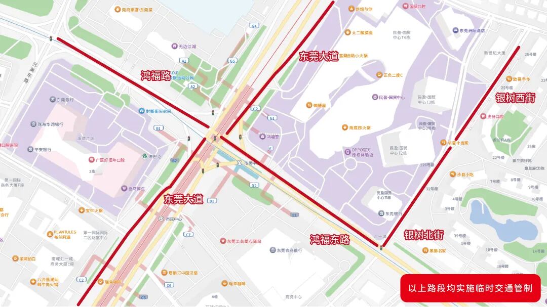 公安机关届时将视情对以上场所及周边,采取动态治安管控措施及临时交通管控措施,请大家给予支持配合,提前做好出行规划。届时东莞大道、鸿福路、鸿福东路、银树西街、银树北街某些区域将动态管控网约车临时停靠。