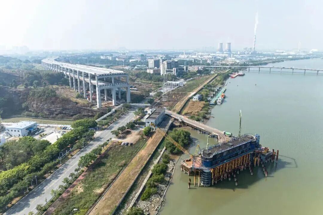 ▲沙仔沥水道桥正在进行盖梁浇筑施工。图源:广东省公路建设有限公司