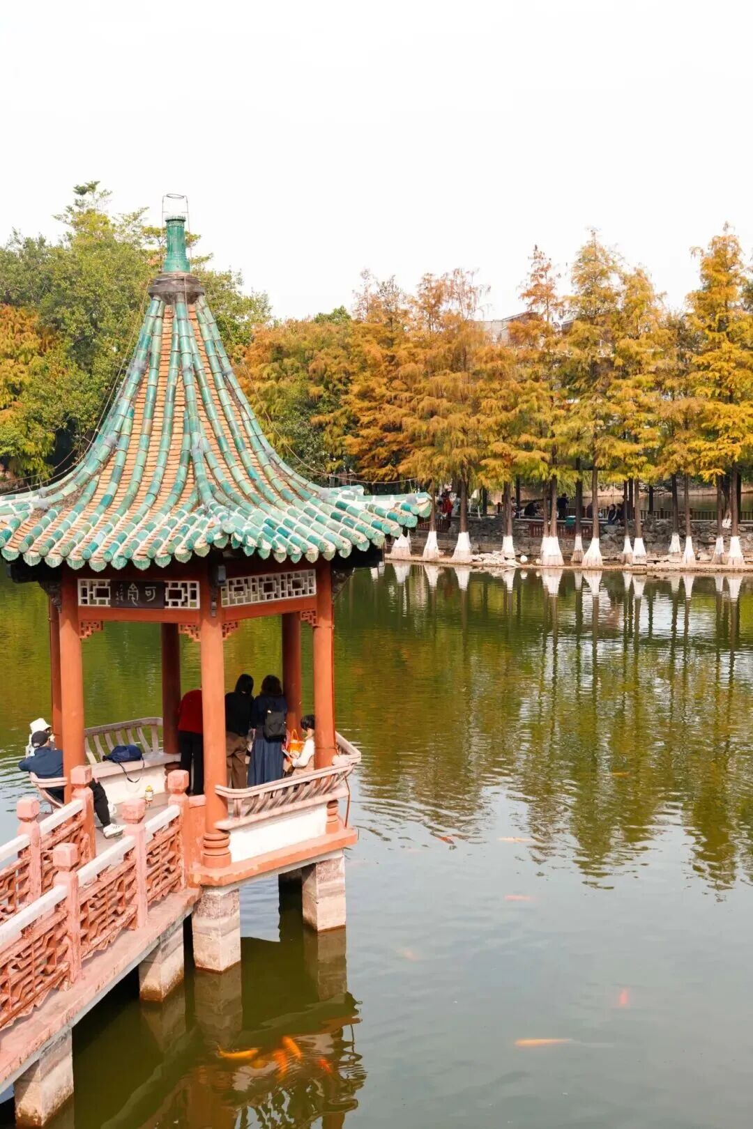 可园博物馆是最佳观赏落羽杉的景点之一,当下落羽杉正处于“渐入佳境”的阶段,一排排落羽杉临湖而生,远看是黄绿红交织的多彩色调,近看有几株水杉红透大半枝叶,多重色彩碰撞出别样韵味。