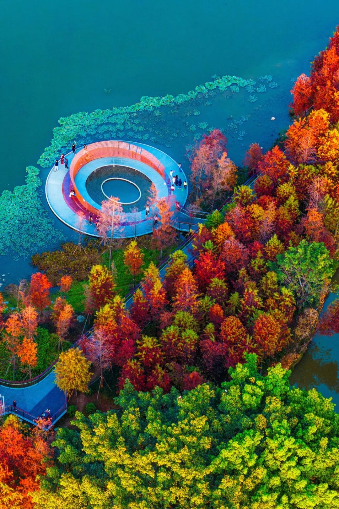 最喜欢的还是沿湖泊生长的落羽杉林。漫步连桥之上,听脚下流水潺潺,眼前是层层晕染的金黄、橘红与深赭,宛如大自然执笔挥洒的油画,置身其中的你也成为了风景。