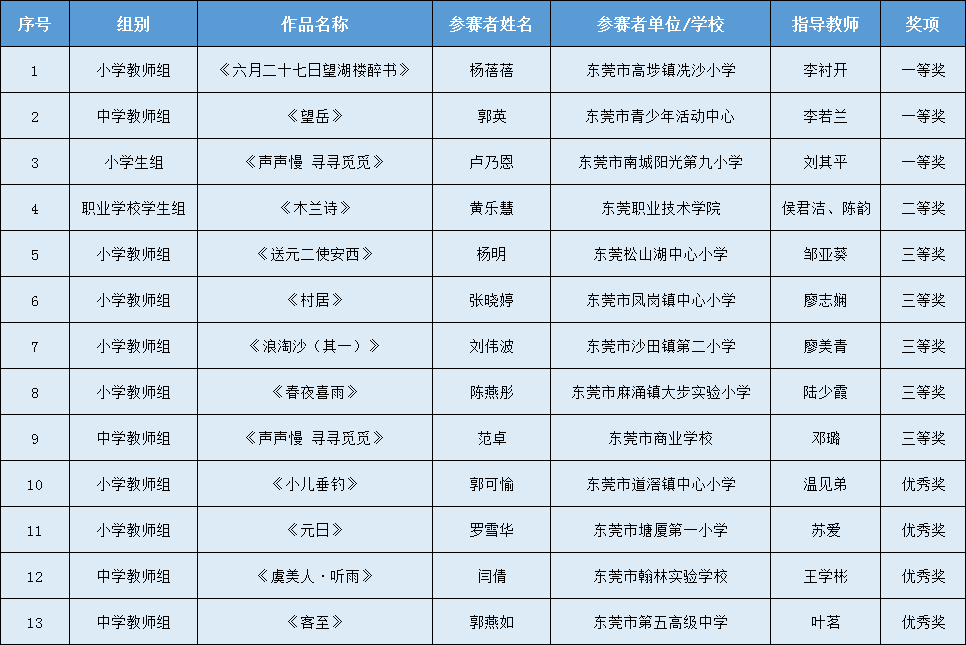 近日,教育部办公厅公布了第七届中华经典诵写讲大赛全国总决赛获奖名单,东莞市选送的作品再创佳绩,展现了我市在中华优秀传统文化传承与创新方面的丰硕成果。 在本届大赛中,东莞共115个优秀作品参加全国总决赛,78个作品获得奖项。其中“诗教中国”有13个获奖作品,“笔墨中国”有55个获奖作品,“诵读中国”有7个获奖作品,“印记中国”有3个获奖作品。此外,9名教师获优秀指导教师奖,东莞市教育局获优秀组织奖。据统计,东莞师生在本届比赛中共获得一等奖14个、二等奖18个、三等奖24个,优秀奖22个,一等奖和优秀指导教师奖数量均居全省第一。 接下来 一起看获奖名单~ 第七届中华经典诵写讲大赛“诗教中国”诗词讲解大赛获奖作品名单(东莞) 第七届中华经典诵写讲大赛“笔墨中国”汉字书写大赛获奖作品名单(东莞) 第七届中华经典诵写讲大赛“诵读中国”经典诵读大赛获奖作品名单(东莞) 第七届中华经典诵写讲大赛“印记中国”师生篆刻大赛获奖作品名单(东莞) 第七届中华经典诵写讲大赛东莞市优秀指导教师获奖作品名单