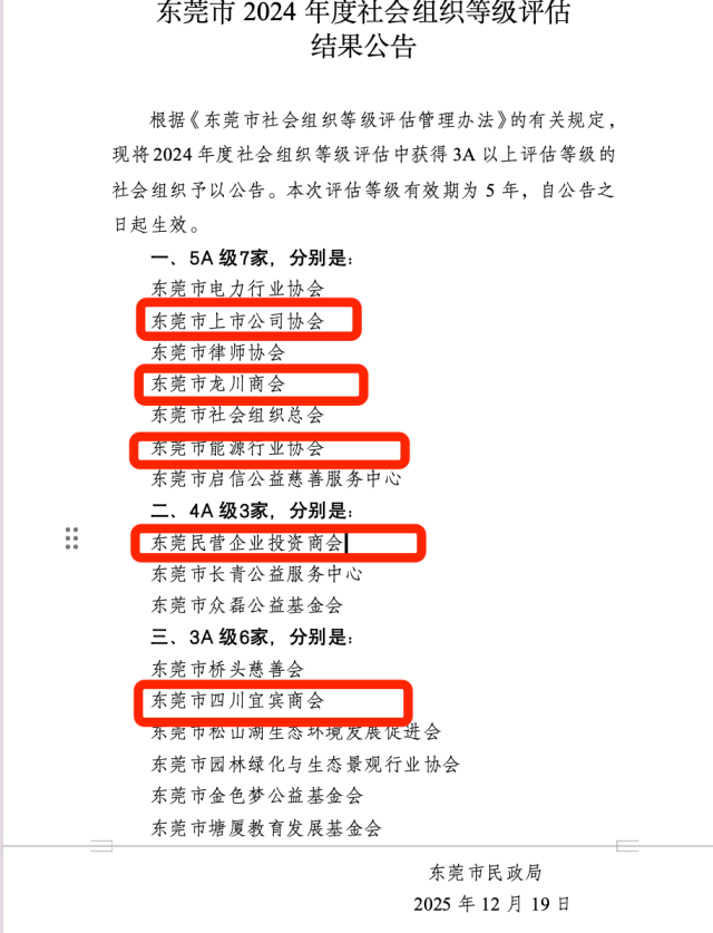 近日,《东莞市2024年度社会组织等级评估结果公告》发布,16家单位获得3A以上评估等级的社会组织,东莞市工商联系统5个单位获评为3A以上等级社会组织,其中3个单位被评定为“5A级社会组织”,分别是东莞市上市公司协会、东莞市龙川商会、东莞市能源行业协会;东莞民营企业投资商会、东莞市四川宜宾商会分别评定为“4A级社会组织”“3A级社会组织”。