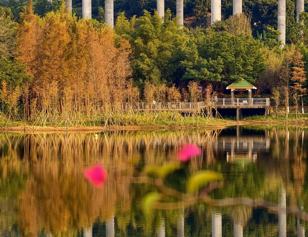 在横岗水库,落羽杉层林尽染,在水天一色中划出一道绚烂的红线。偶有白鹭在林间穿梭盘旋,红白相映,勾勒出人与自然和谐共生的画卷。